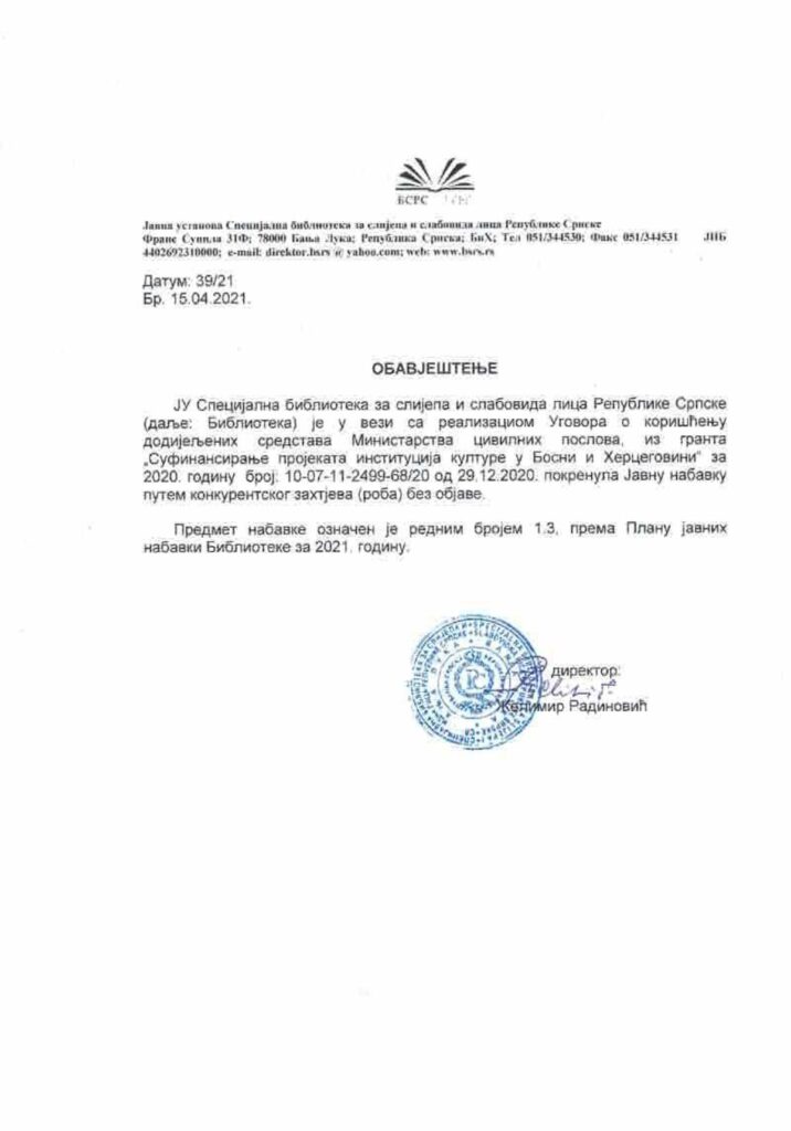 Обавјештење о покретању јавне набавке путем конкурентског захтјева (роба) без објаве апр 16, 2021 | Јавне набавке